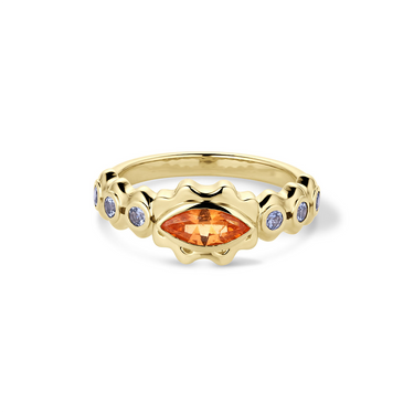 She is a MOMENT and we are here for it: this funky orange garnet marquise pairs beautifully with the Yogo sapphires next to her in this wavy playful design.