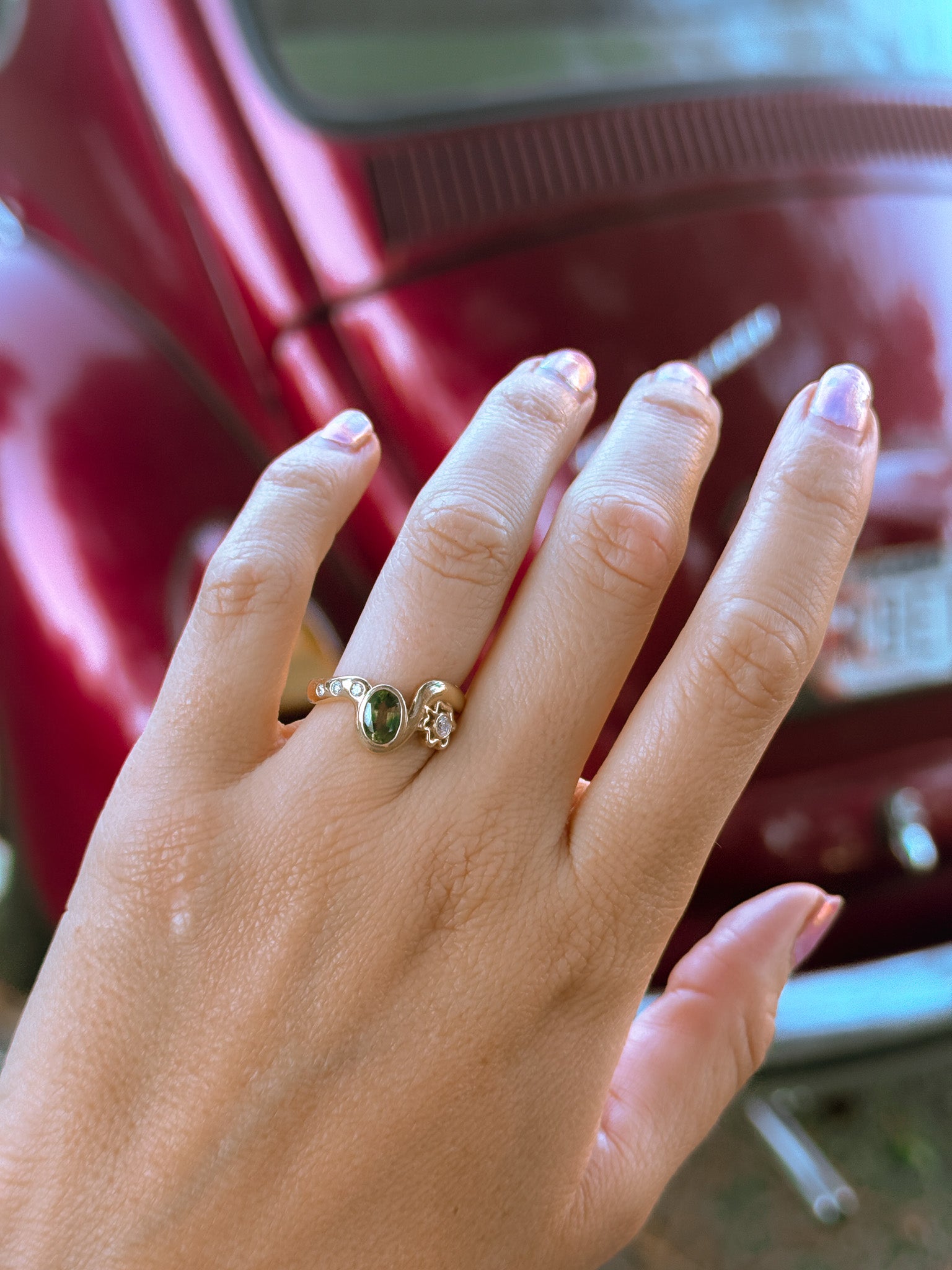 This beautiful green sapphire engagement ring was designed for our client and includes a white diamond in a funky bezel next to the main centerstone.